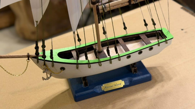 ماکت روی پایه چوبی قرار گرفته و ایستایی مناسبی دارد. ترکیب چوب، پارچه بادبان و اتصالات ظریف، حس اصالت و کیفیت را منتقل میکند.