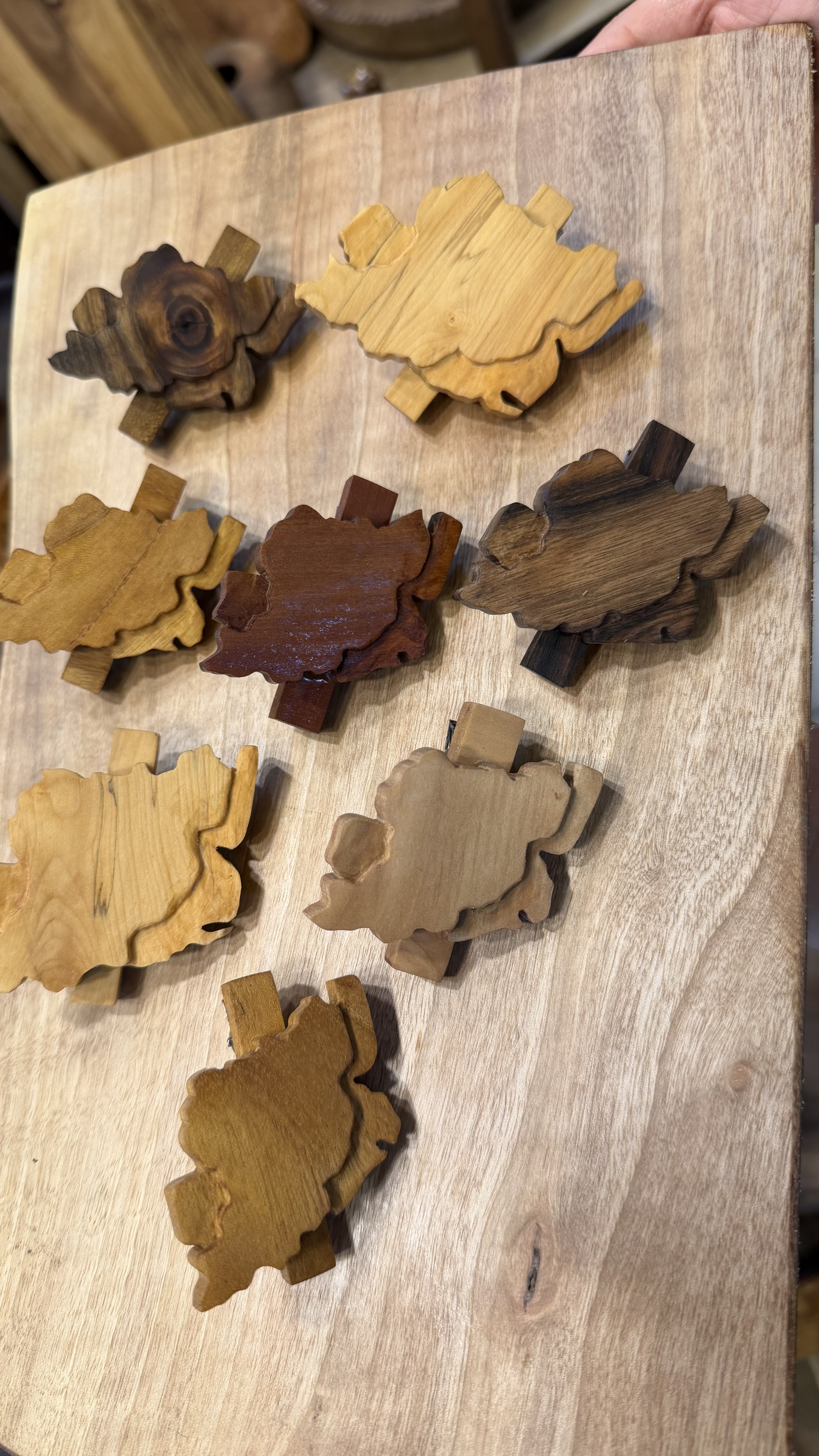 گیره موی چوبی دستساز با طرح نقشه ایران، ساختهشده از چوب طبیعی. سبک، خاص و مناسب استفاده روزمره و هدیه.